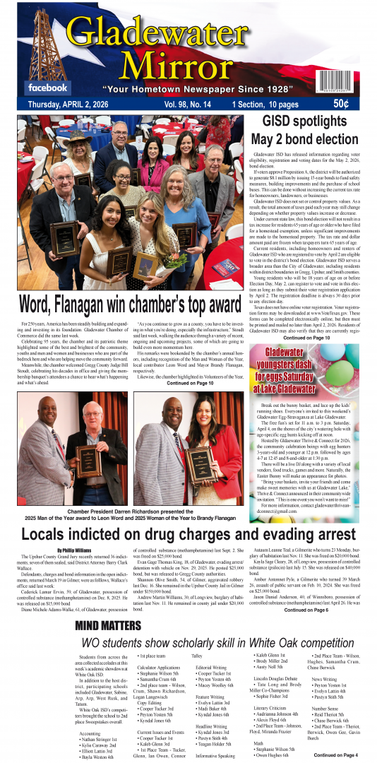Recent NewsGladewater Chamber of Commerce – Souvenir Edition Banquet Tab3 hours ago390Read More Anglers Catch Hundreds of Record-Setting Fish in 20252 days ago2780MIND MATTERS | Local students show scholarly skill in White Oak competition1 week ago6370GFD Fire Captain takes reins as chief1 week ago6720White Oak ISD committee revisits “Wallflower” Thursday1 week ago5520 Chamber marks 95 years Thursday night1 week ago5440GFD Fire Captain takes reins as chief today1 week ago8630Great Texas Birding Classic, Great Texas Wildlife Trails Celebrate 30th Anniversary2 weeks ago4430Editorial | Transparency shouldn’t be dammed up2 weeks ago8140Fire chief, dam, fees, on-street parking among council’s issues Thursday evening2 weeks ago7640Latest dam inspection report shows the good, the bad, the unchanged2 weeks ago8920White Oak library will remove 7th book after challenge2 weeks ago1.3K0Union Grove’s Tuesday showcase spotlights pathways for Career & Technical Education2 weeks ago3730GISD urges families to back off buzzing beverages3 weeks ago1.3K0Gladewater Band Car Show returns downtown March 213 weeks ago6360