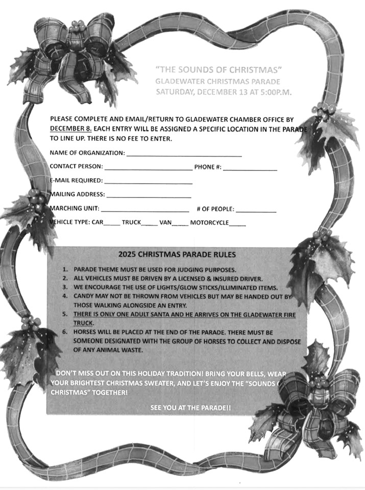 Notably, “There is only one adult Santa, and he arrives on the Gladewater fire truck,” the chamber emphasized. Also, “Horses will be placed at the end of the parade. There must be someone designated with the group of horses to collect and dispose of any animal waste.