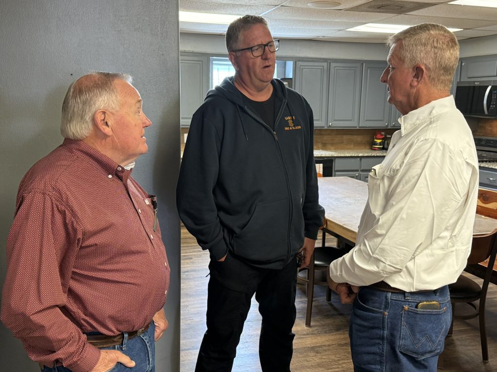 Gladewater Fire Chief Tim Basham (right) speaks with his predecessor, former Chief Mike Simmons (center), and Gladewater City Manager Charlie Smith Monday.