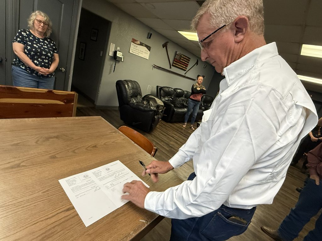 Gladewater Fire Chief Tim Basham signs the necessary documentation after officially taking the reins at Gladewater Fire Department March 23.