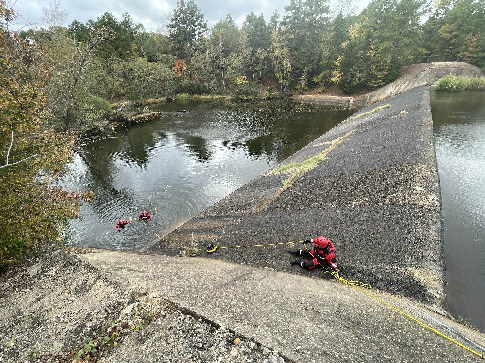 Wednesday’s dam close-up gave firefighters an opportunity to simultaneously drill their water rescue tactics as SPI engineer Andrew Wright joined the crew with a hardy camera ready to capture better images of the dam. Suited up for the chill water, the team carefully descended from the top of the dam’s earthen portion to shore level below the concrete spillway before leaping in.
