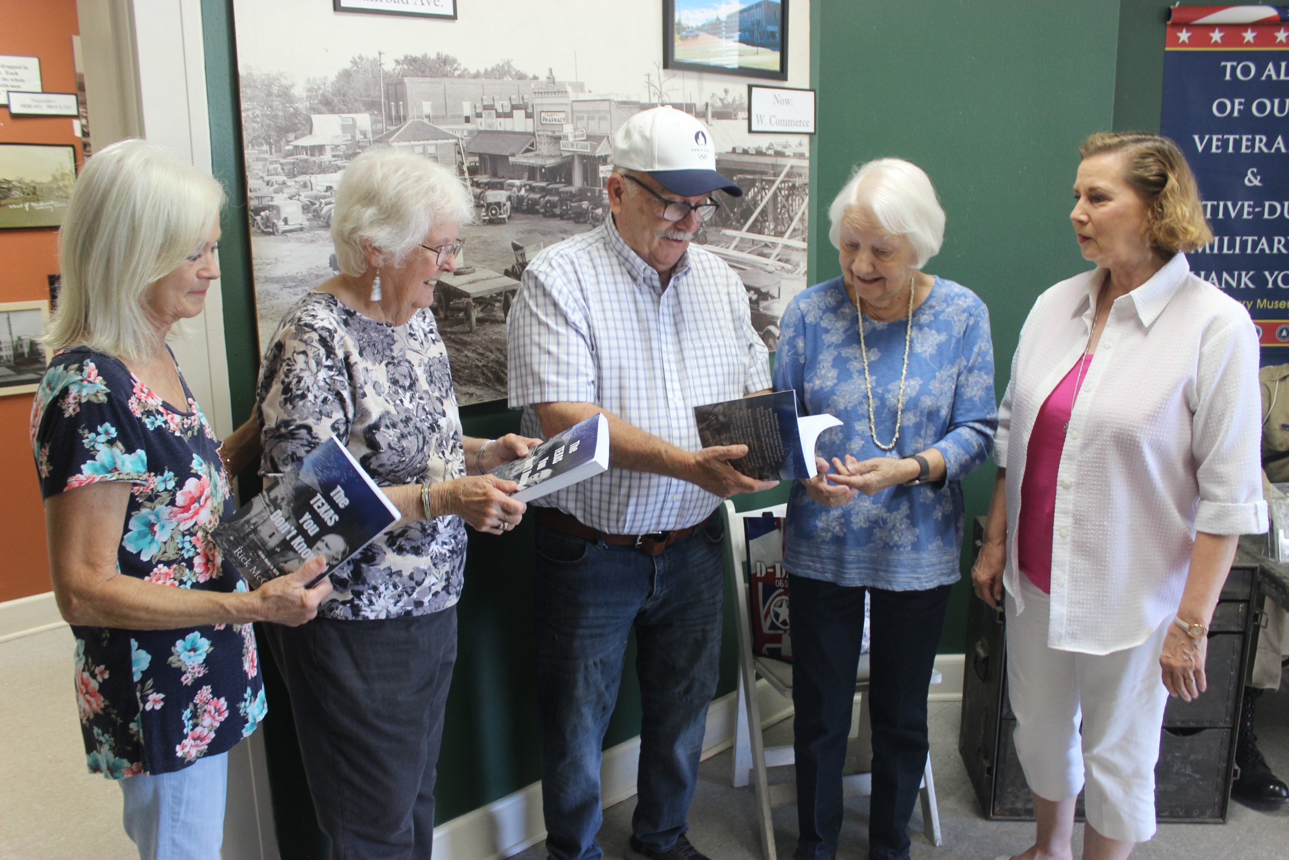 [Local retired educator and author Rick McCaw drops off copies of his new book, “The Texas You Don’t Know,” July 19 to Gladewater Museum’s history aficionados (from left) Beth Lewis, Elaine Roddy and Elane Osteen alongside his wife – and editor – Mindy.]