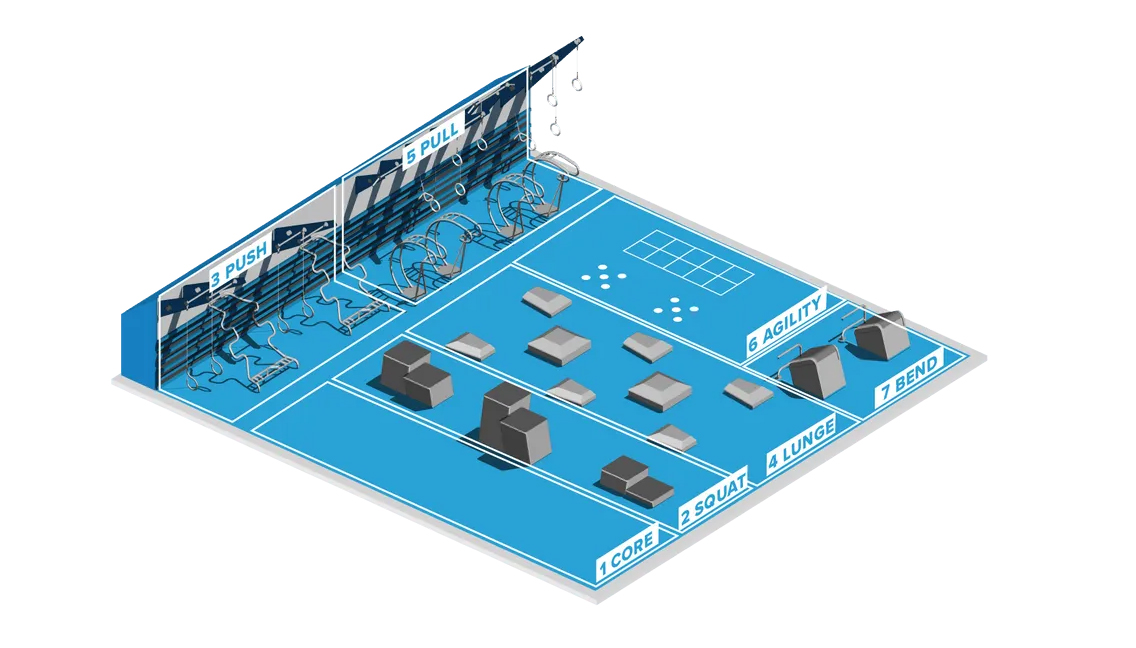 “Redesigned for the 21st century, the Fitness Court is the world’s best outdoor gym,” according to founder Mitch Menaged. “Our seven-movement, seven-minute system allows you to use your own body weight to get the perfect workout.”