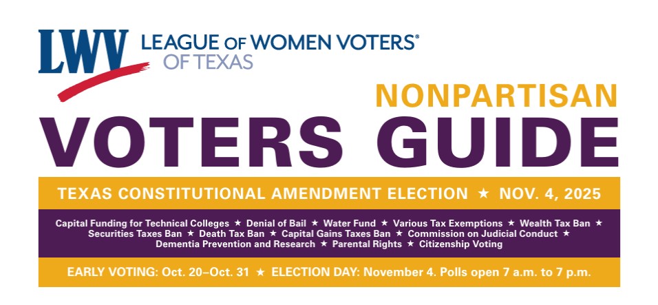 The League of Women Voters of Texas has published another comprehensive, nonpartisan voters guide with early voting underway and Election Day coming soon in the Texas Constitutional Amendment & Special Election.