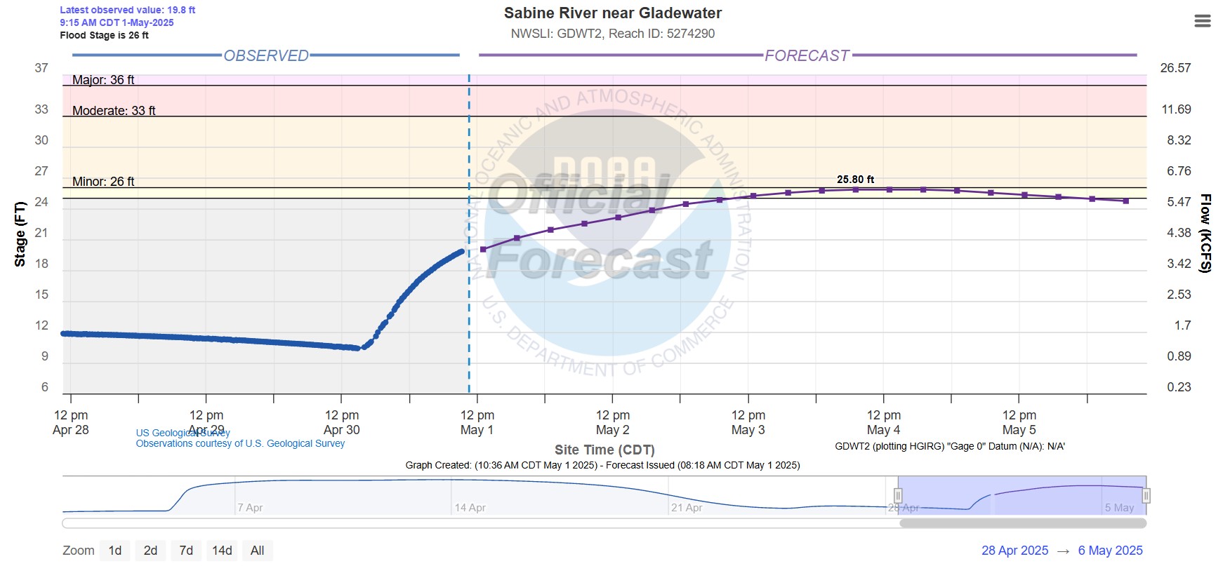 As of 9:15 a.m. Thursday, May 1, the observed level near Gladewater was at 19.8 feet after climbing about 9.5 feet from the previous afternoon.