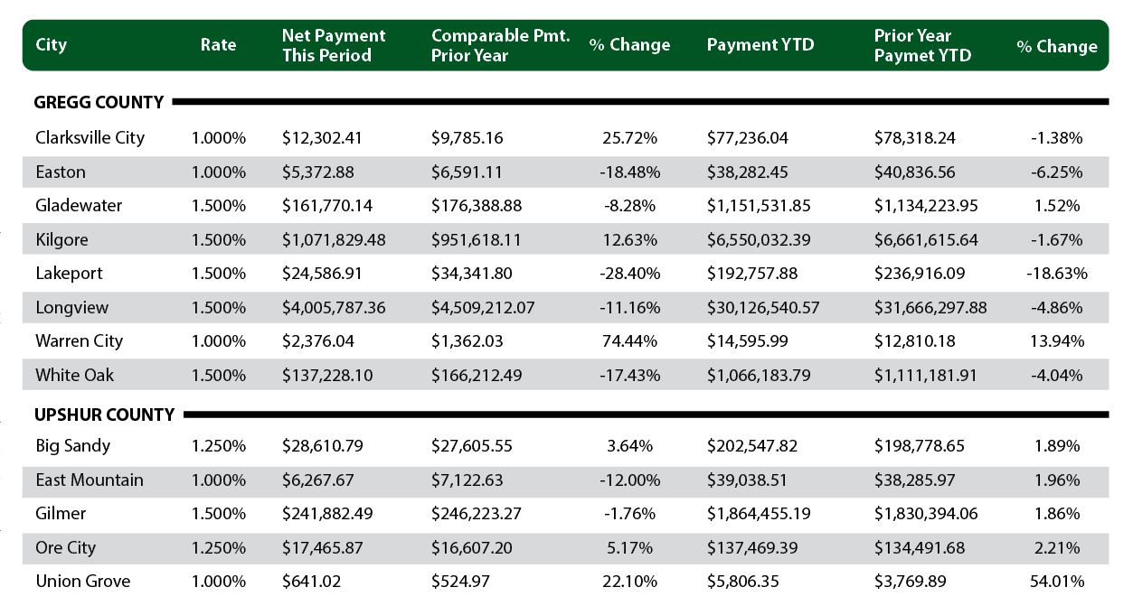In Upshur County, Union Grove’s thin $641 check is 22.1 percent more than it saw in August ’23. Gilmer’s monthly allocation declined 1.76 percent from 12 months back.
