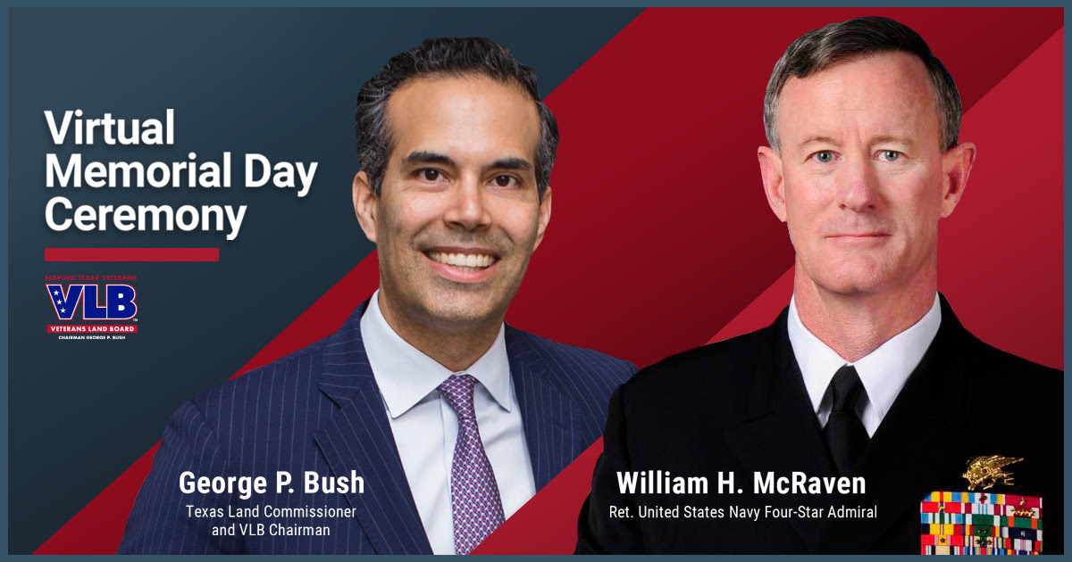 The ceremony will feature Retired U.S. Navy Four-Star Admiral William McRaven as our keynote speaker and remarks by Veterans Land Board Chairman George P. Bush. A wreath-laying ceremony and a performance of “Taps” will be conducted over live stream from our Central Texas Veterans Cemetery in Killeen. Please join us in remembering Texas’ fallen heroes.
