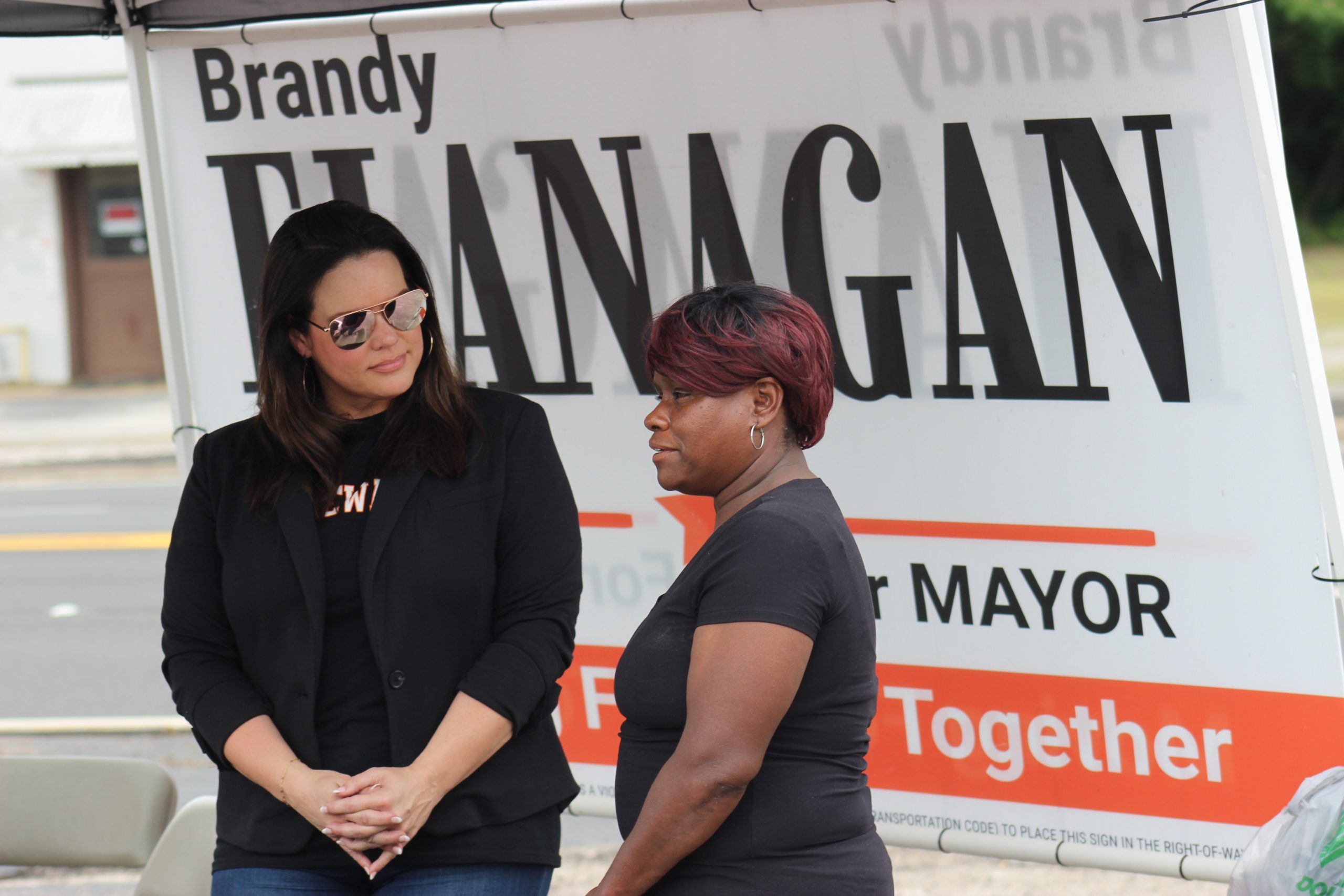 [Above: Gladewater Mayor-elect Brandy Flanagan (left) visits with Sandra Smith Saturday afternoon outside Gladewater City Hall. Flanagan netted 229 votes to secure the seat in her May 4 contest with Jim Valentine (206 votes), according to unofficial results released Saturday evening.]