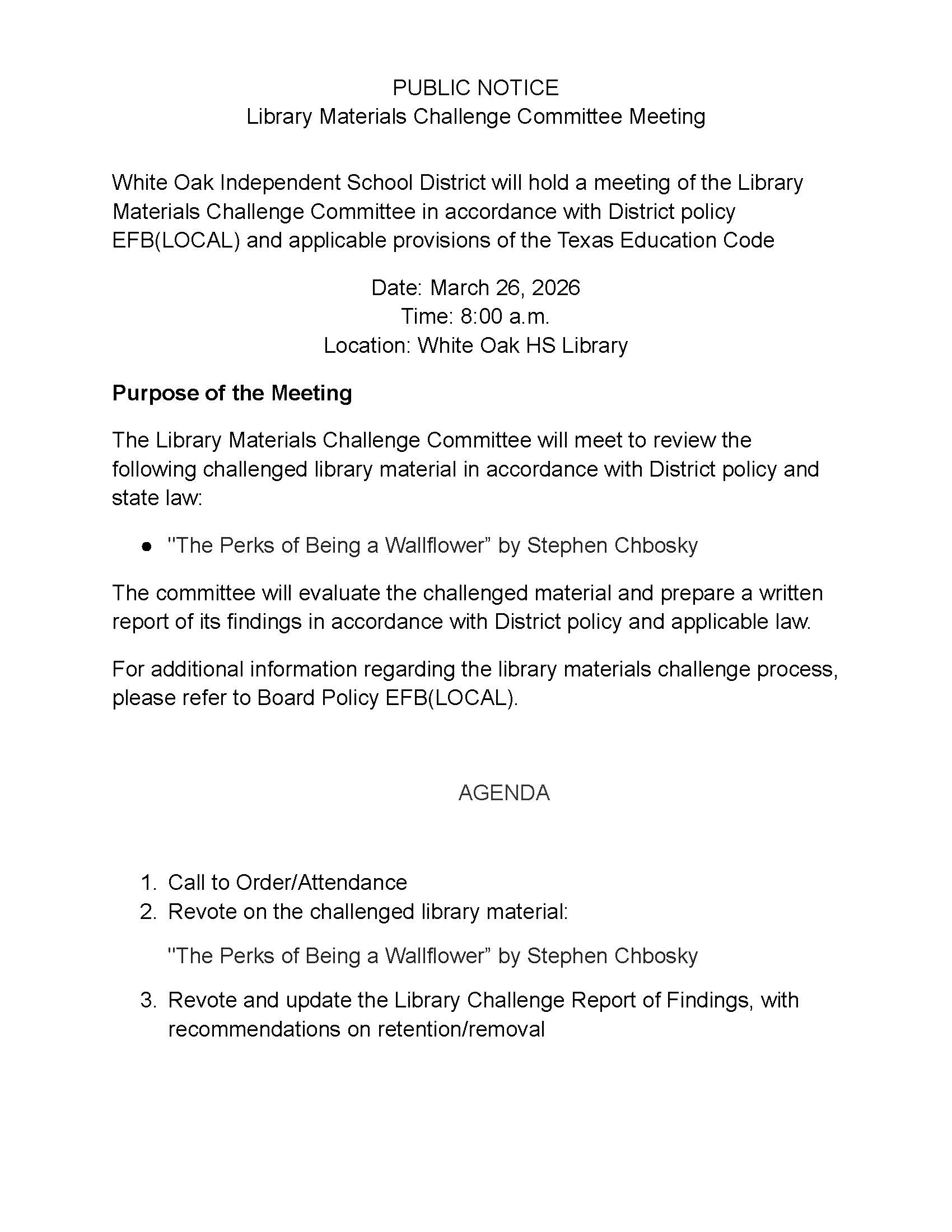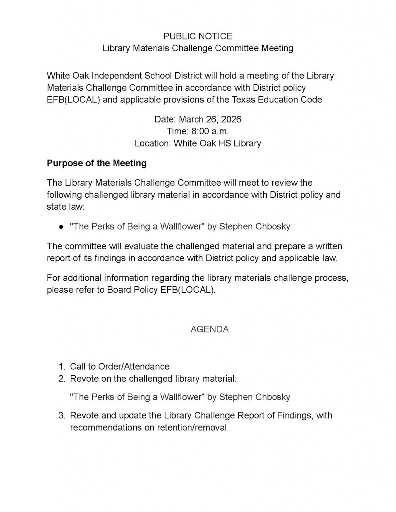 WOISD has fielded three book challenges so far this year. The fourth meeting March 26 begins at 8 a.m. in the White Oak High School Library and is again open to the public. The meeting does not include a Public Comment section.